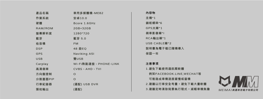 主機、鎖框螺絲*6、GPS天線*1、倒車影像線*1、RCA輸出線*1、USB CABLE線*2、說明書(電子檔已隨機導入)